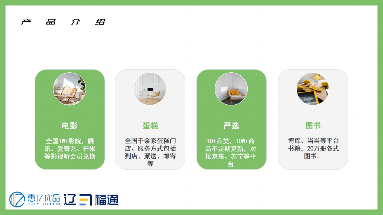 平台为企事业单位提供关于春节、端午、中秋、党建、女神节、劳动节、儿童节、送清凉 等多节日礼包卡券方案推荐,包含商品有生活百货、电影、图书、演出、蛋糕、门票、视听会员 等多品类可选,还可承接各类员工活动,提供从 策划、物料、场地到落实 的一站式服务;