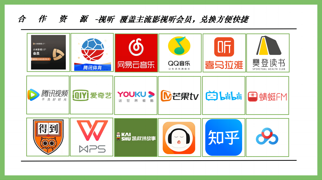 视听:腾讯爱奇艺优酷等主流影视听会员兑换。